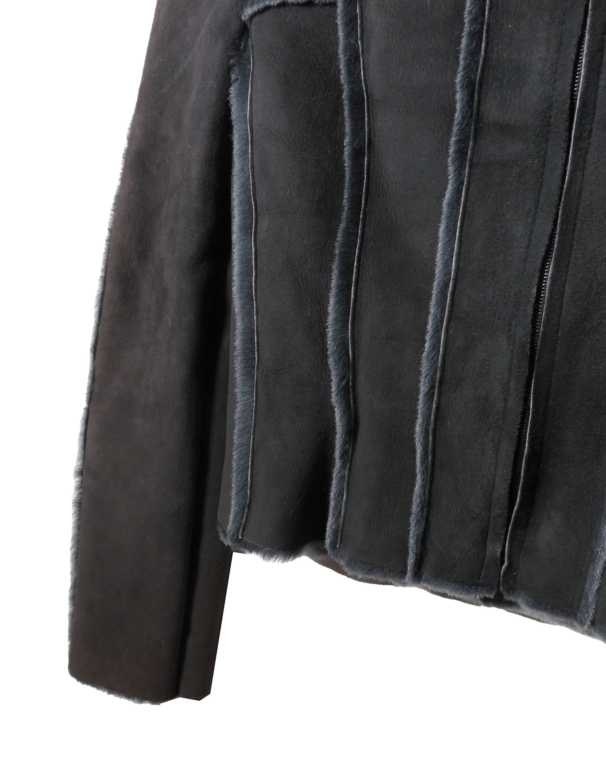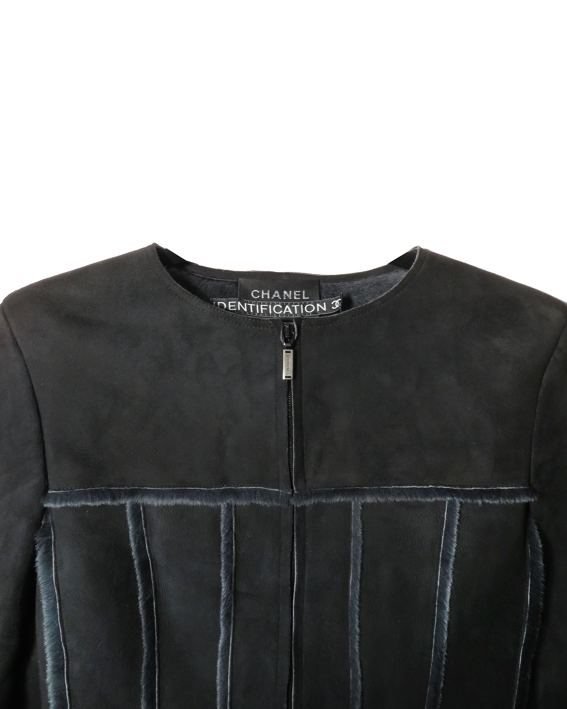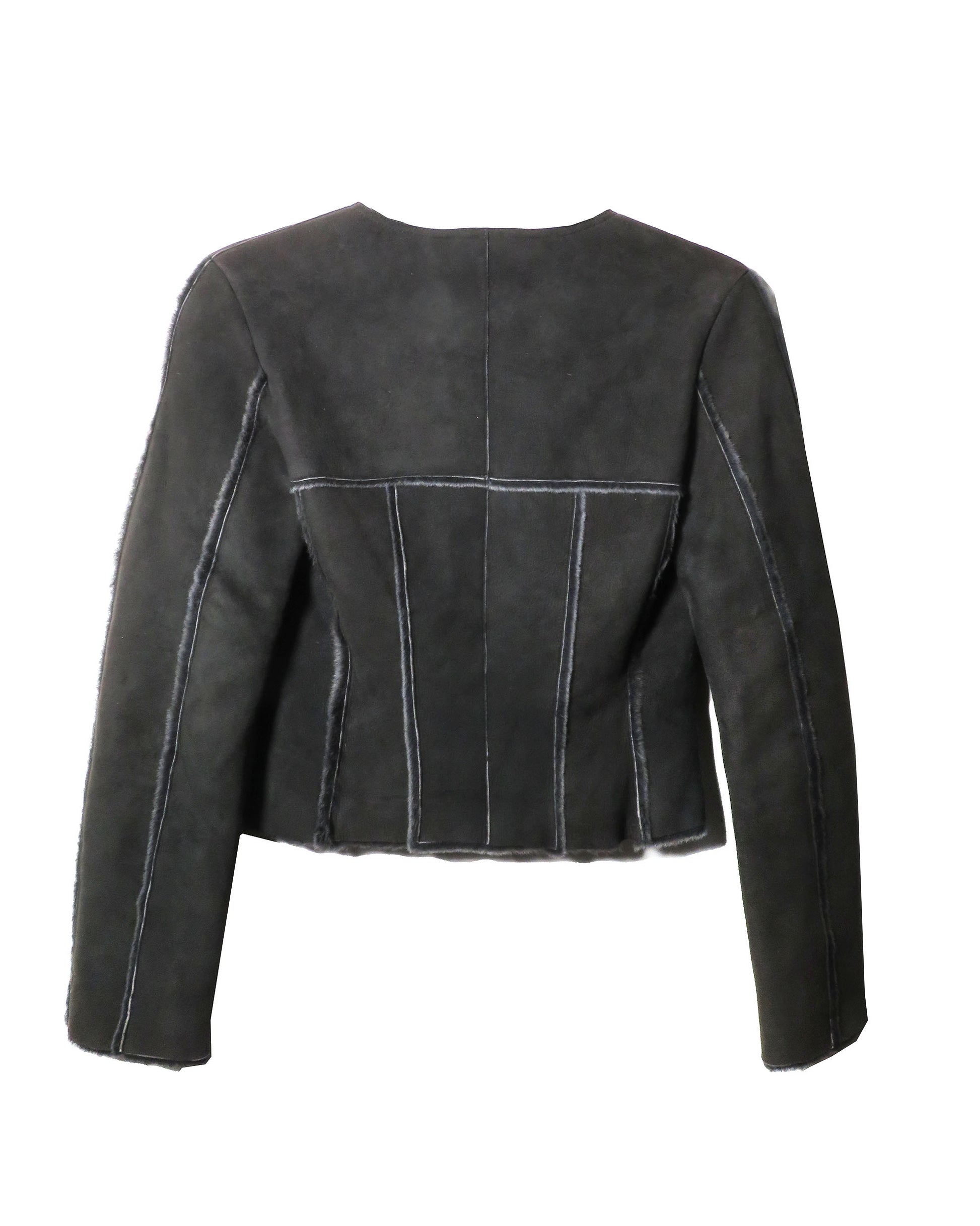 From Chanel’s Fall/Winter 1999 runway collection (Look 1), this rare cropped jacket is part of the Identification line under Karl Lagerfeld. Made in France from dark grey lambskin with a soft suede finish, the jacket features vertical panel construction with fur trims, giving it a sculptural, body-contouring silhouette. Finished with a concealed central zipper, round neckline, and minimal hem.