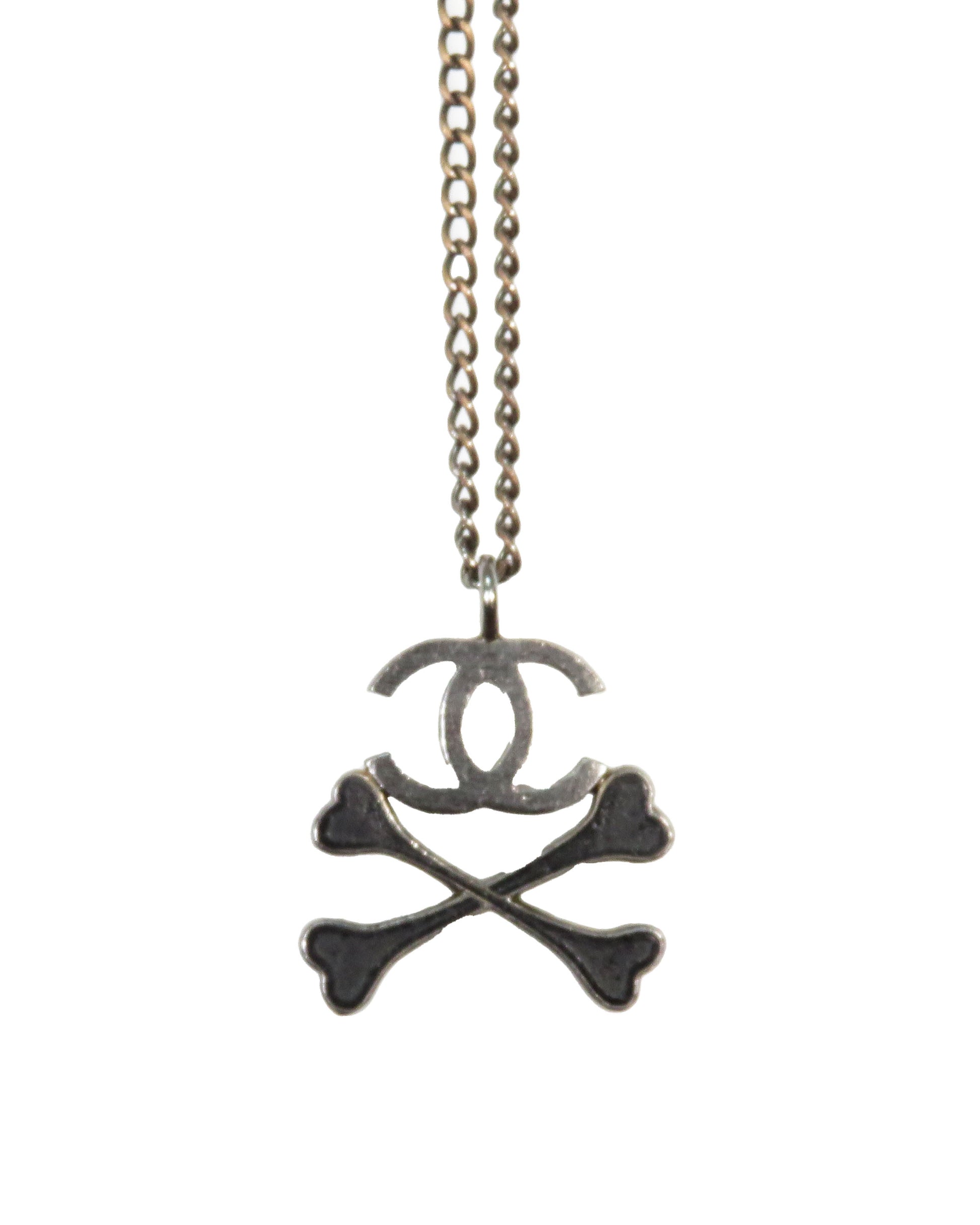 Rare necklace from Chanel’s Fall/Winter 2003 collection, featuring a silver-tone chain and pendant with the classic interlocking CC logo above a crossed bones motif, giving a playful twist to the skull-and-crossbones symbol.