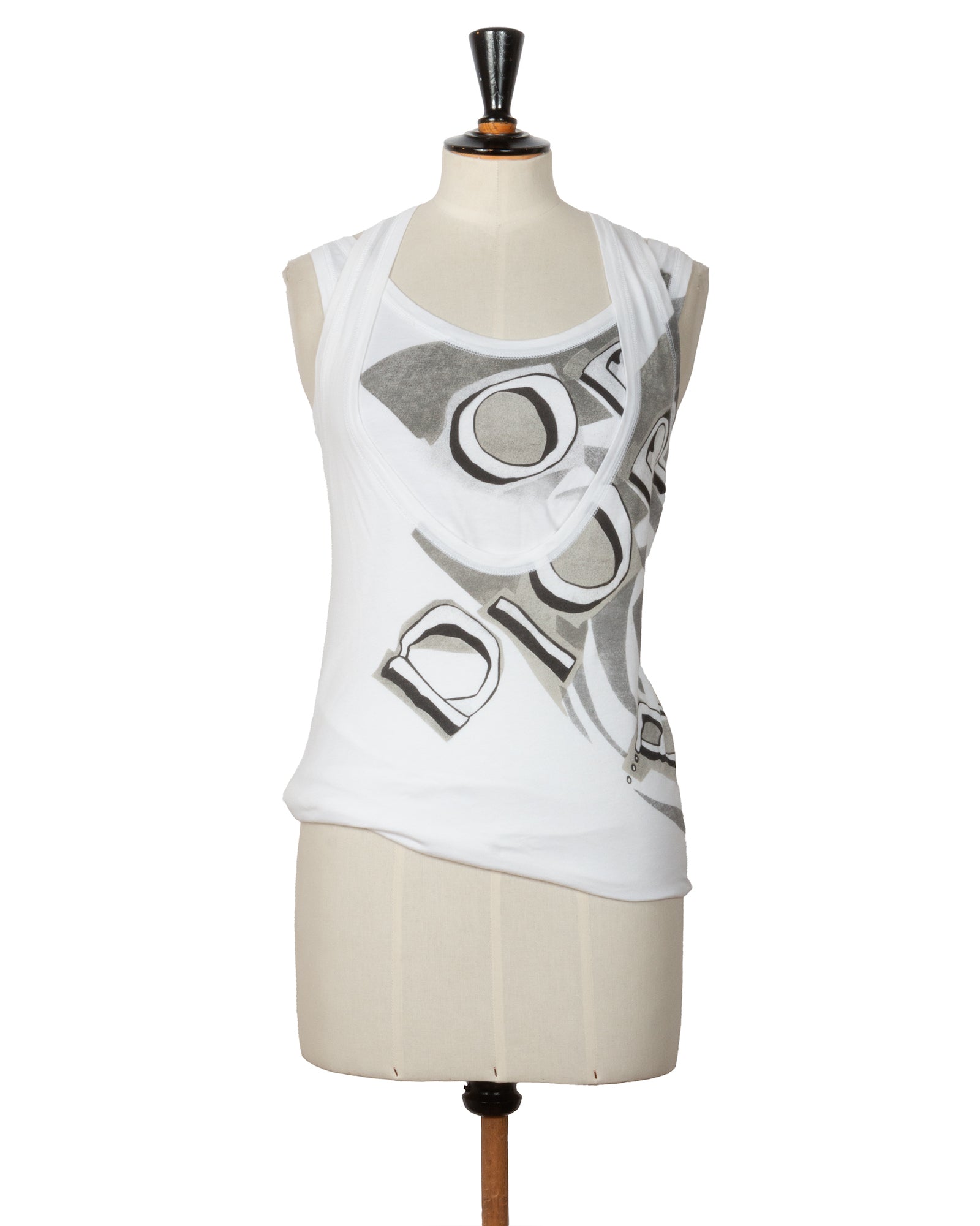 This graphic tank top is from Christian Dior’s SS2004 collection, designed by John Galliano. As seen on the runway, this piece features an oversized, abstract Dior logo print across the front and back in shades of black, white, and gray. An iconic piece from one of Galliano's standout collections