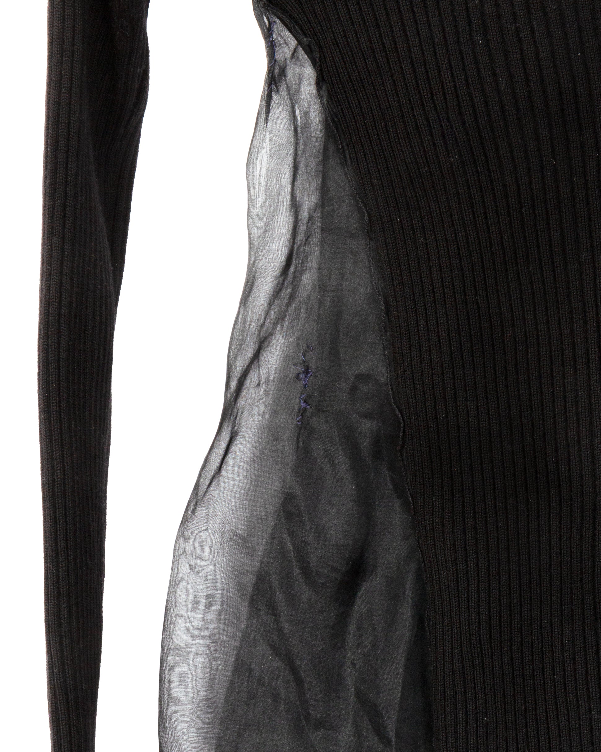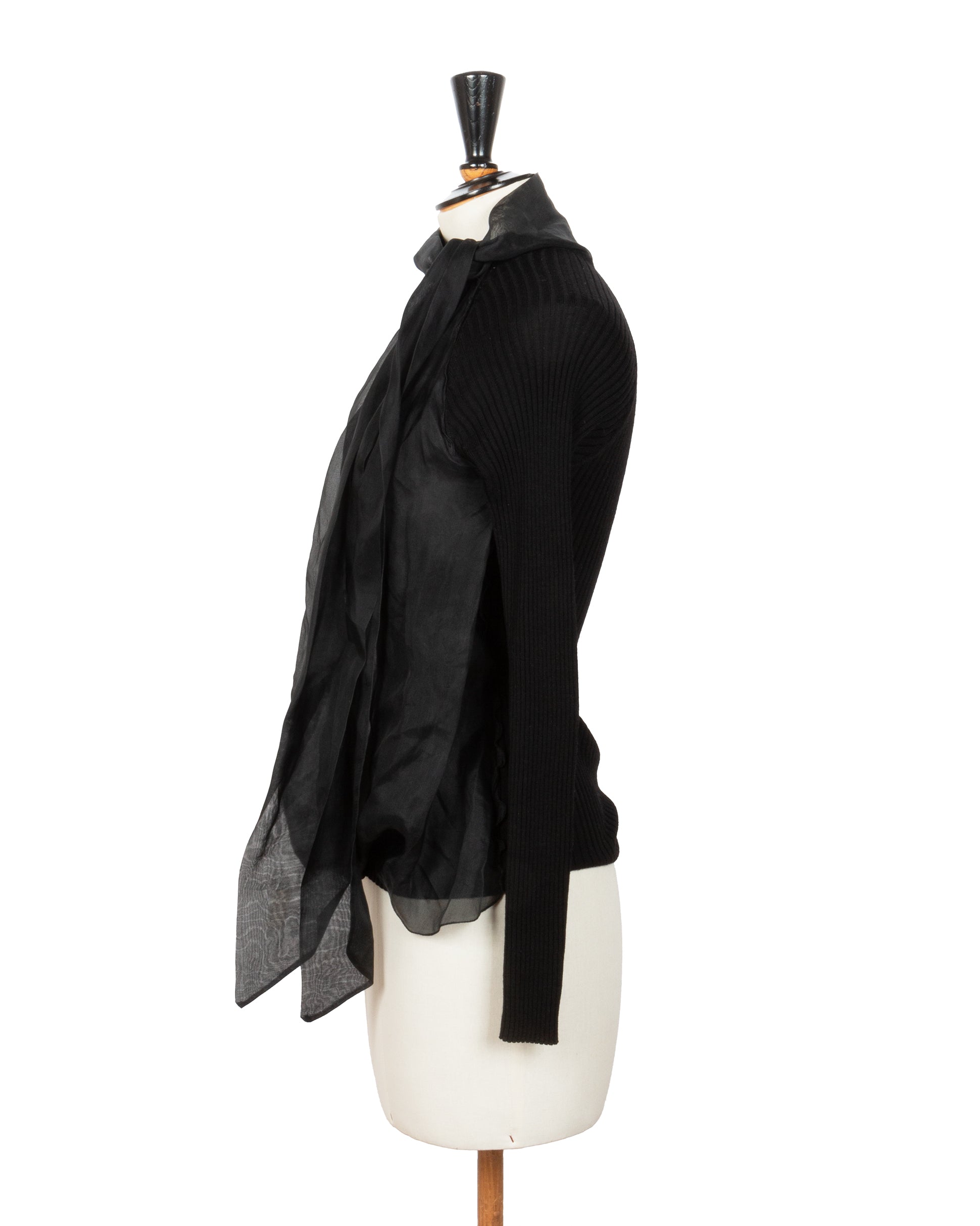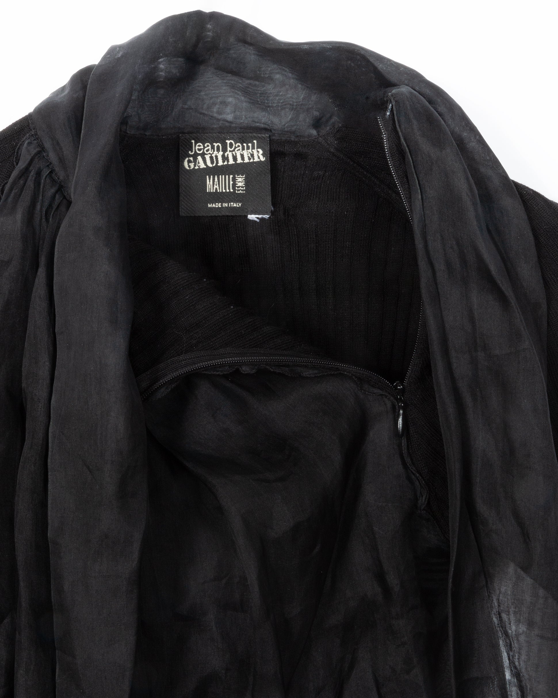 Black ribbed knit long sleeve top with an integrated sheer overlay draped across the front and sides. The attached sheer panel extends from the neckline to form an asymmetric scarf-like silhouette, with one end cascading below the hem. Features a side zipper closure under the overlay. From the Jean Paul Gaultier Maille line.