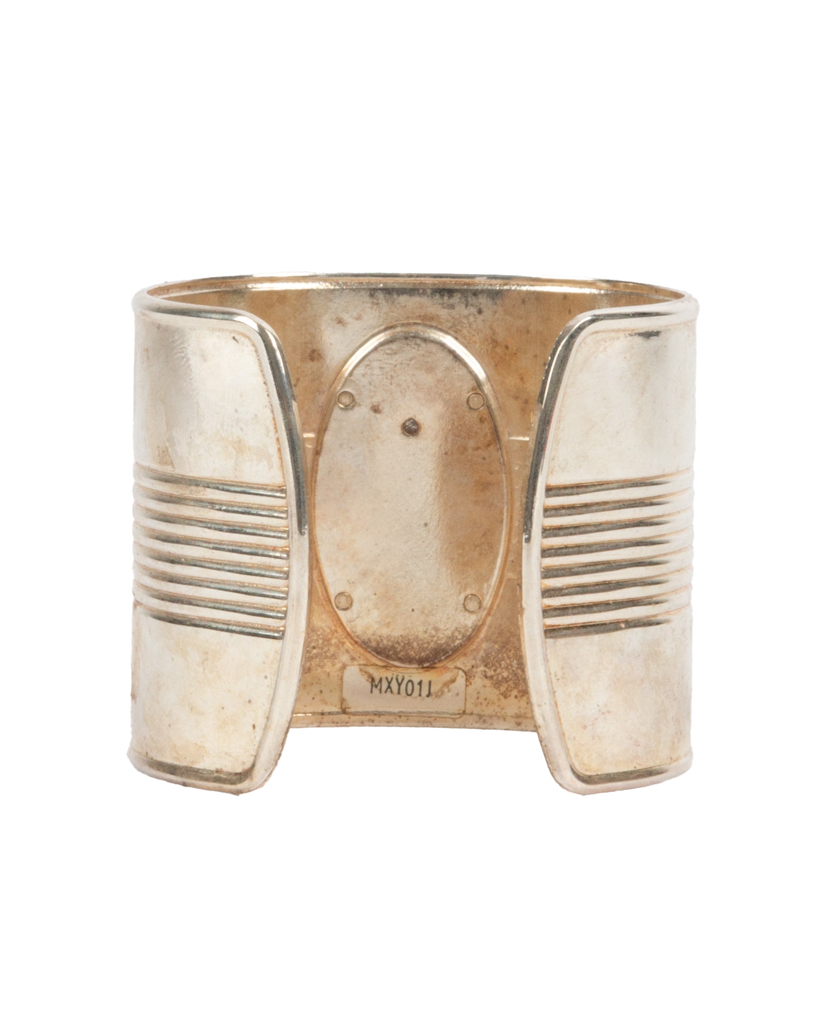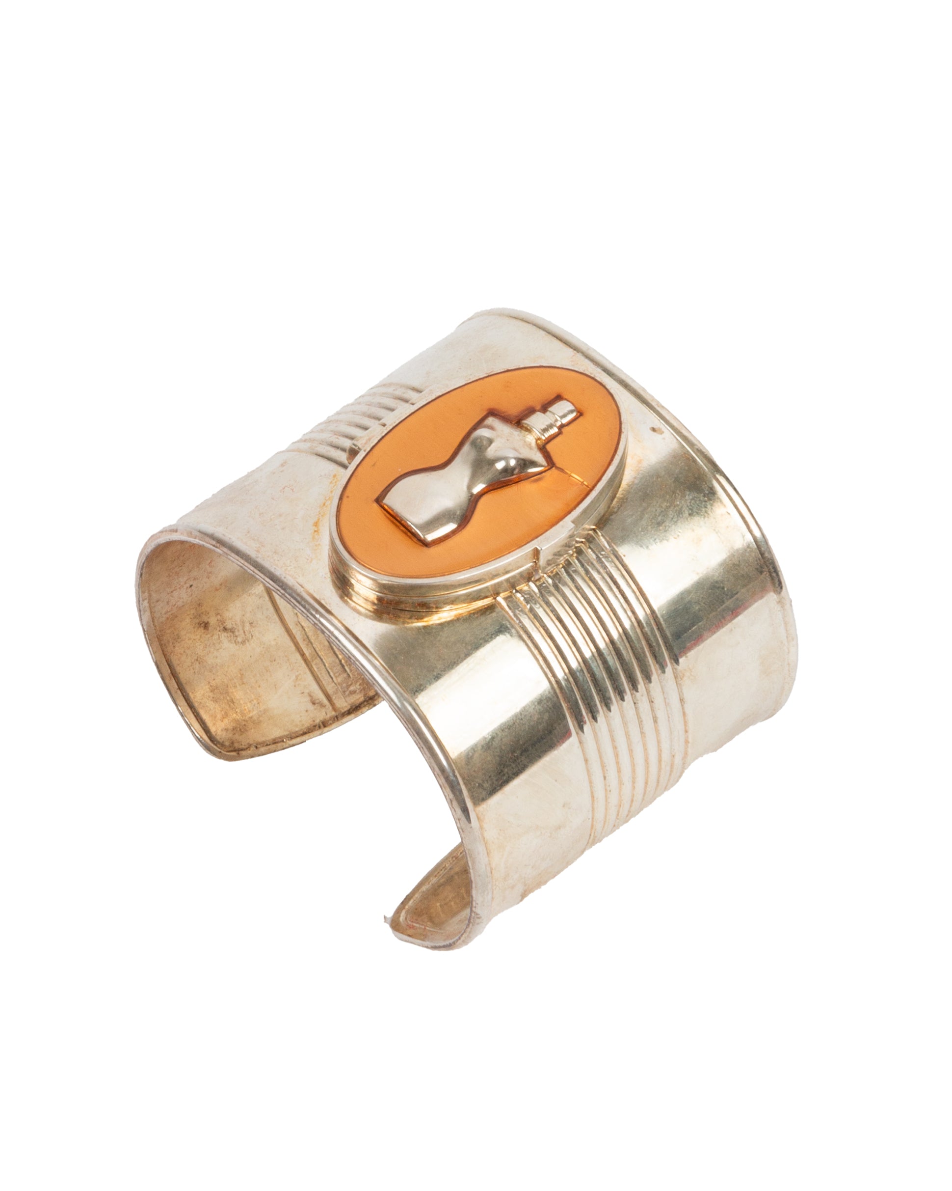 Rare Jean Paul Gaultier wide metal cuff, seen on Kim K at one of the Gaultier shows, featuring the iconic Classique perfume bottle silhouette, set in an amber-toned oval centerpiece. The face flips open to reveal a fragrance balm inside the cuff. Silver-tone finish with ribbed detailing along the sides and stamped with MXY011 on the back. Comes with original cylindrical display case with red base.