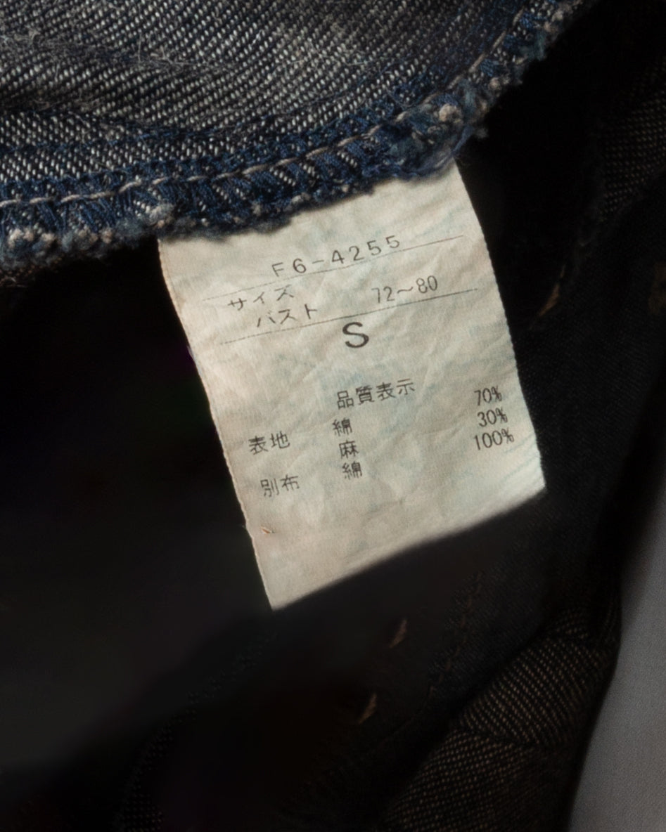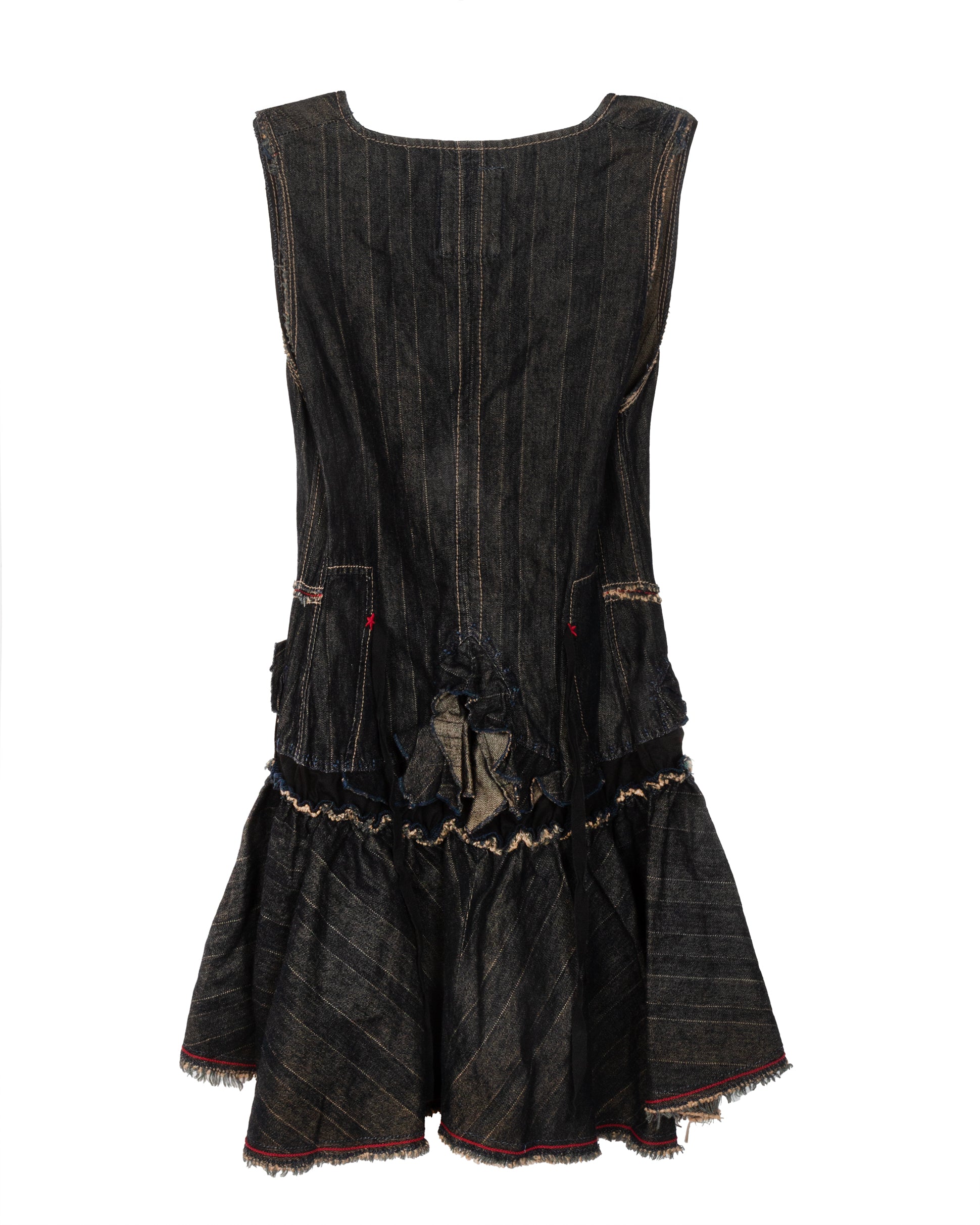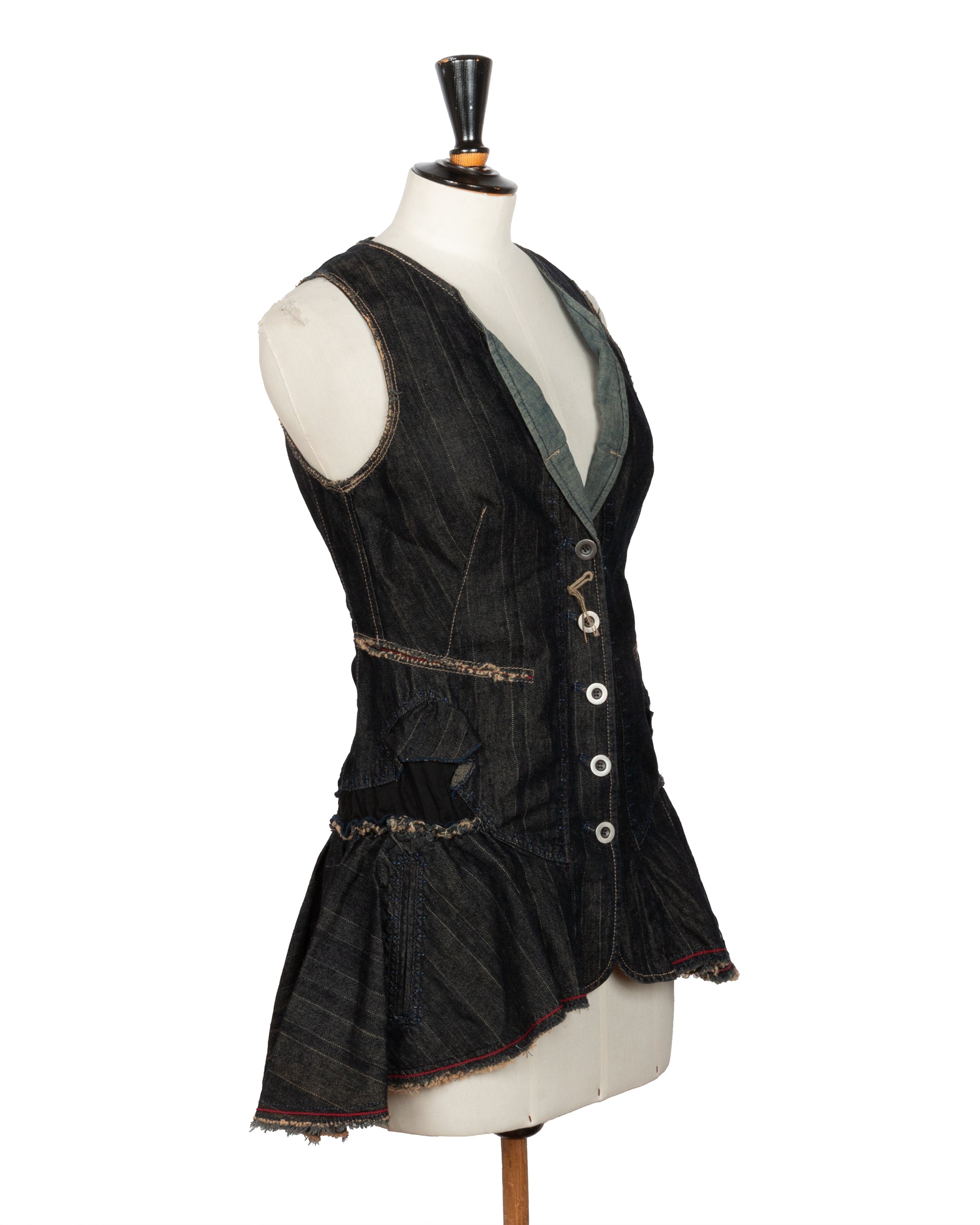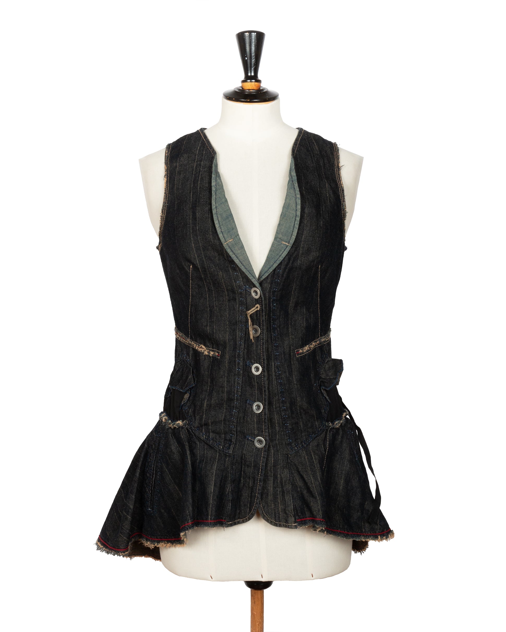 Dark-wash denim top featuring raw edges, asymmetric paneling, and contrast topstitching. Button-up front with white buttons. Frayed hem with red stitching accents. Functional pockets and structured detailing at the hips.