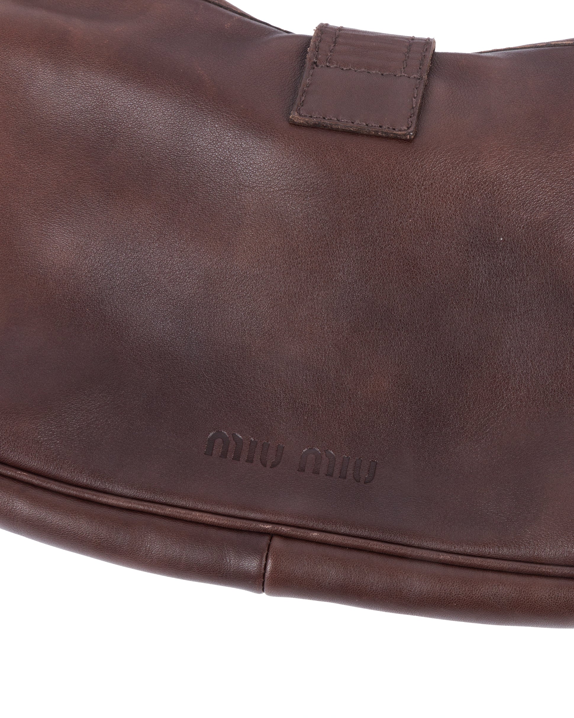 Vintage Miu Miu shoulder bag in chocolate brown leather with curved crescent silhouette and silver-tone hardware. Features a wide structured strap with large metal rings and a clip clasp detail on the front. Subtle embossed Miu Miu branding at the back. Interior lined in brown cotton with a zip pocket and engraved Miu Miu metal tag.