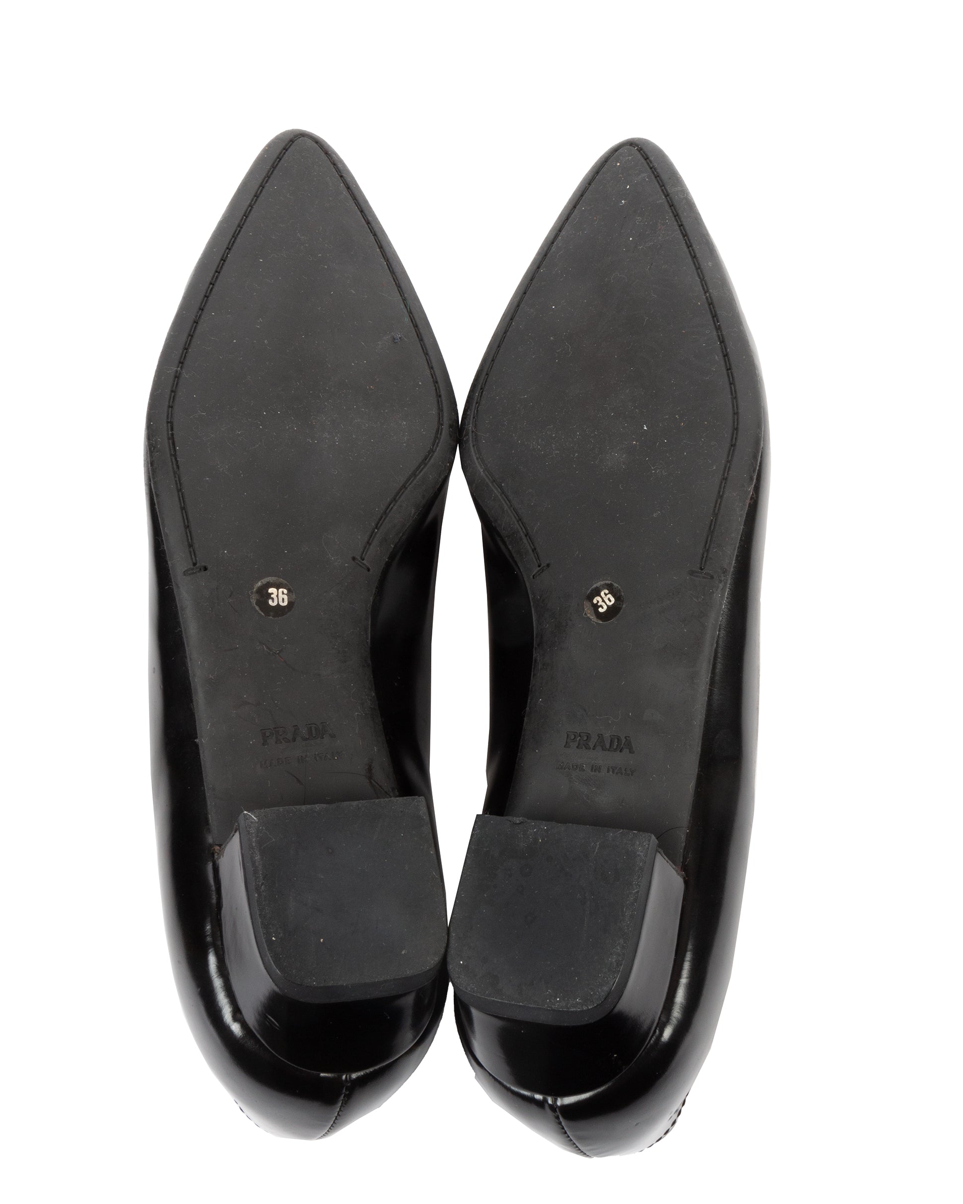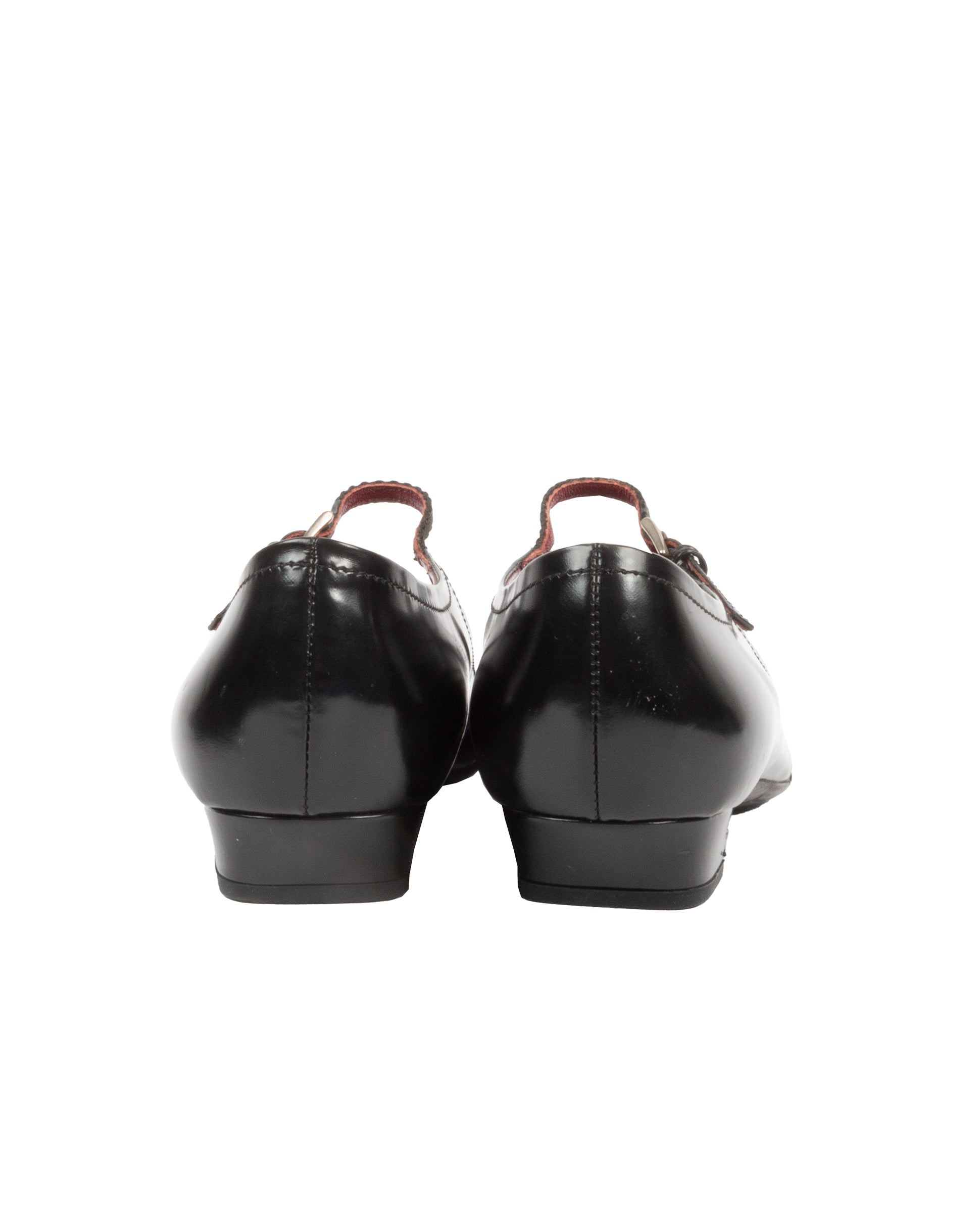 Black patent leather pointed-toe Mary Jane flats with a low square heel, red leather interior, and adjustable buckle strap across the instep. Features stitched edges and leather soles.