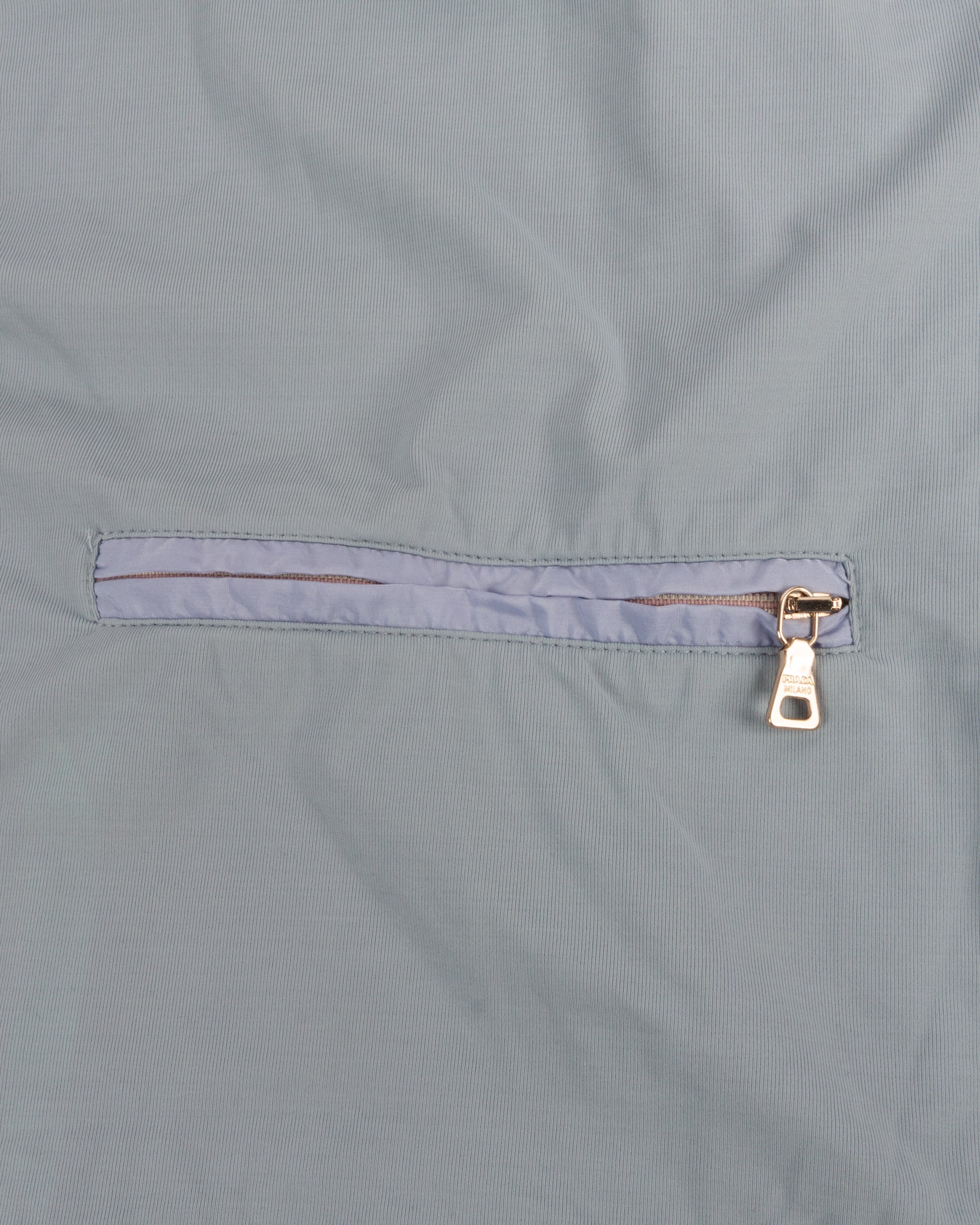 Early 2000s Prada Sport technical short sleeve t-shirt in powder blue nylon blend fabric. Features a rounded neckline, red rubber Prada tag at the left hip, and a small zip pocket on the lower back with tonal nylon trim and metal zip pull.