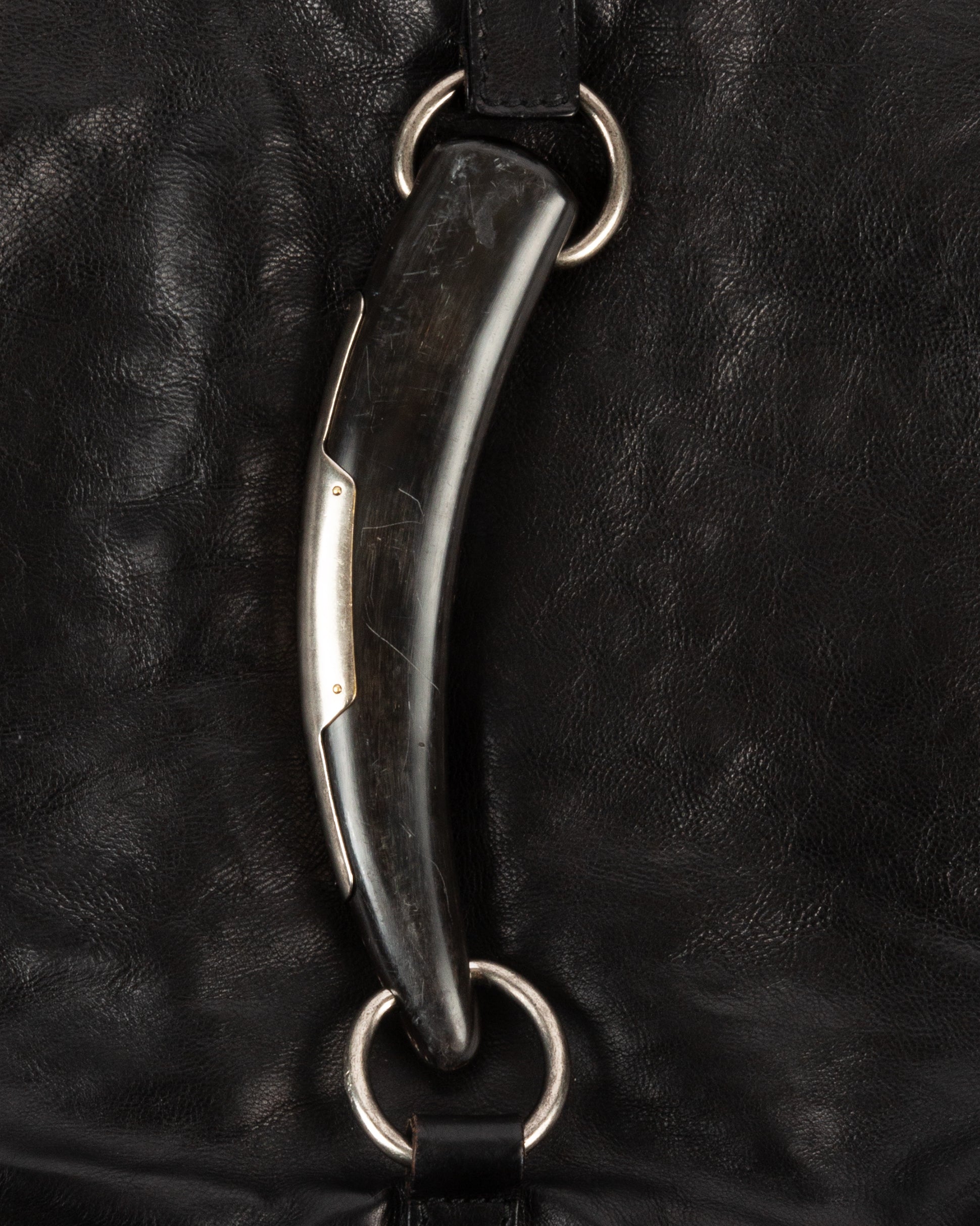 Black leather Yves Saint Laurent Mombasa hobo bag with a signature horn decoration, attached to the bag with silver-tone metal rings, designed by Tom Ford. Features a slouchy, crescent-shaped body with visible paneling details, an adjustable leather shoulder strap with buckle accents, and a magnetic snap closure. This is the same style worn by Bella Hadid.
